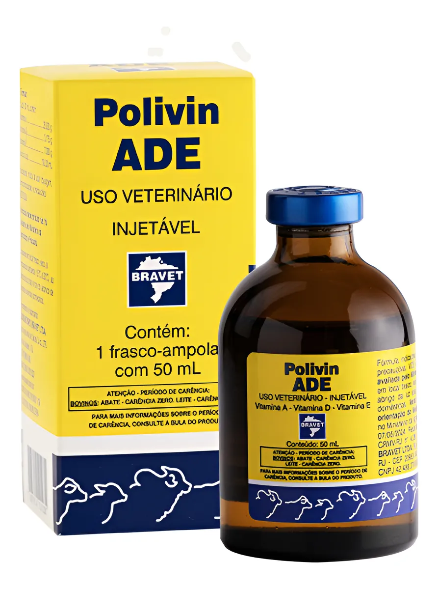 O Polivin A.D.E 50 mL da Bravet é um suplemento vitamínico injetável de uso veterinário, formulado com altas concentrações de vitaminas A, D3 e E, essenciais para o crescimento, reprodução, fortalecimento ósseo e imunidade de animais de produção. Indicado para bovinos, suínos, ovinos e caprinos, o produto é ideal para prevenir e tratar carências nutricionais que afetam o desempenho e o desenvolvimento do rebanho.