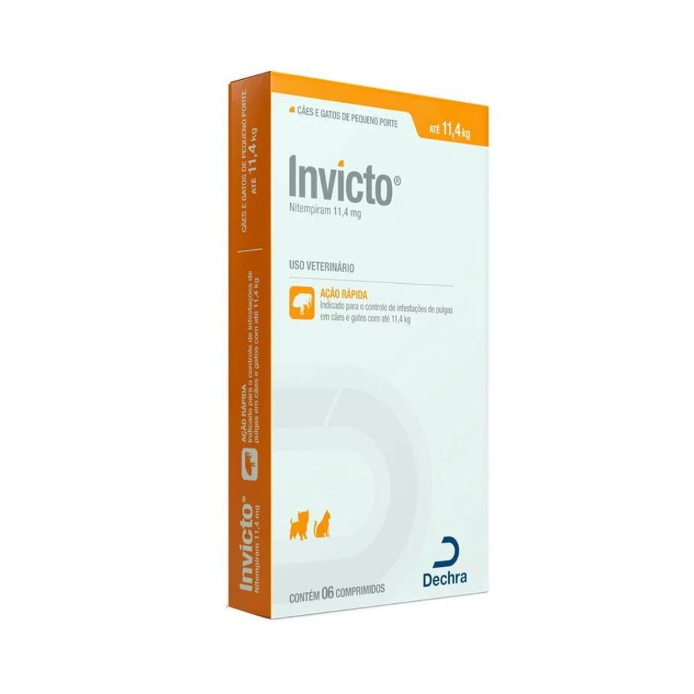 O Antipulgas Invicto Decra 11,4mg é uma medicação base nitempiram, que combate a ação de pulgas que causam coceira e inrritação que causam dermatites (alérgicas á saliva e picada de pulgas e ectoparasitas) e verminoses (Dipylium caninum) , que age apartir de 15 minutos na corrente sanguinea em cachorros e gatos.
